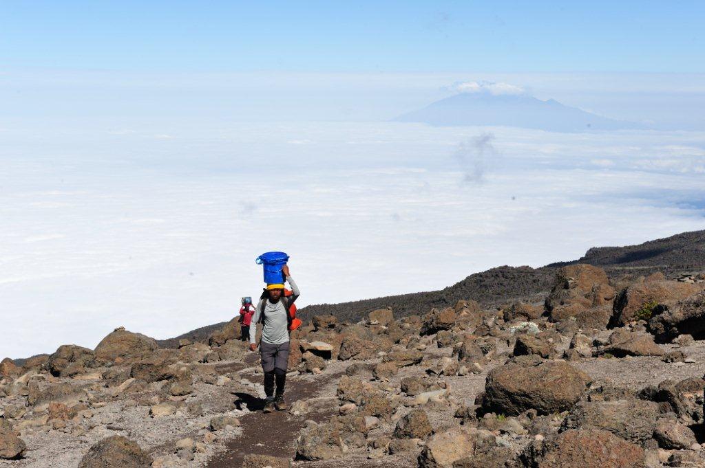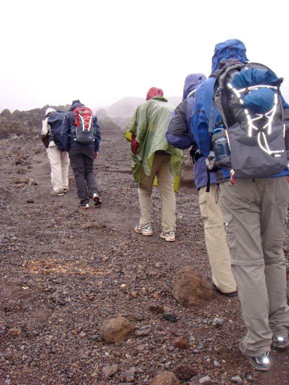 Today the group will take a slow trek over intervening ridges and valleys to join the Mweka Route, which will be their descent route. They will hike up the ridge through sparse landscape and alpine desert for another hour to the Barafu Hut. The last water on the route is in the Karanga Valley; there is no water at Barafu Camp (even though Barafu is the Swahili word for “ice”), which means that the porters will now be carrying the water. Their tents will be pitched on a narrow, stony, wind-swept ridge. At Barafu, they will need to consume a big lunch (and later dinner) and lots of liquids as they prepare themselves for tonight’s departure for the summit.