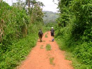 Message just in from Sean: “Equatorial foothills of the Rwenzoris are lush, with misty pinnacles in the distance. Everyone is chuffed. Andrew splashed out on chinese floral brolly.”